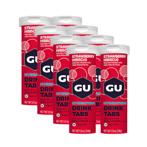 GU Energy Strawberry Hibiscus Hydration Drink Tabs are a low-calorie drink option with 20mg of caffeine. They include xylitol for gastrointestinal comfort and sodium to help maintain water balance and replenish fluids lost through sweating.